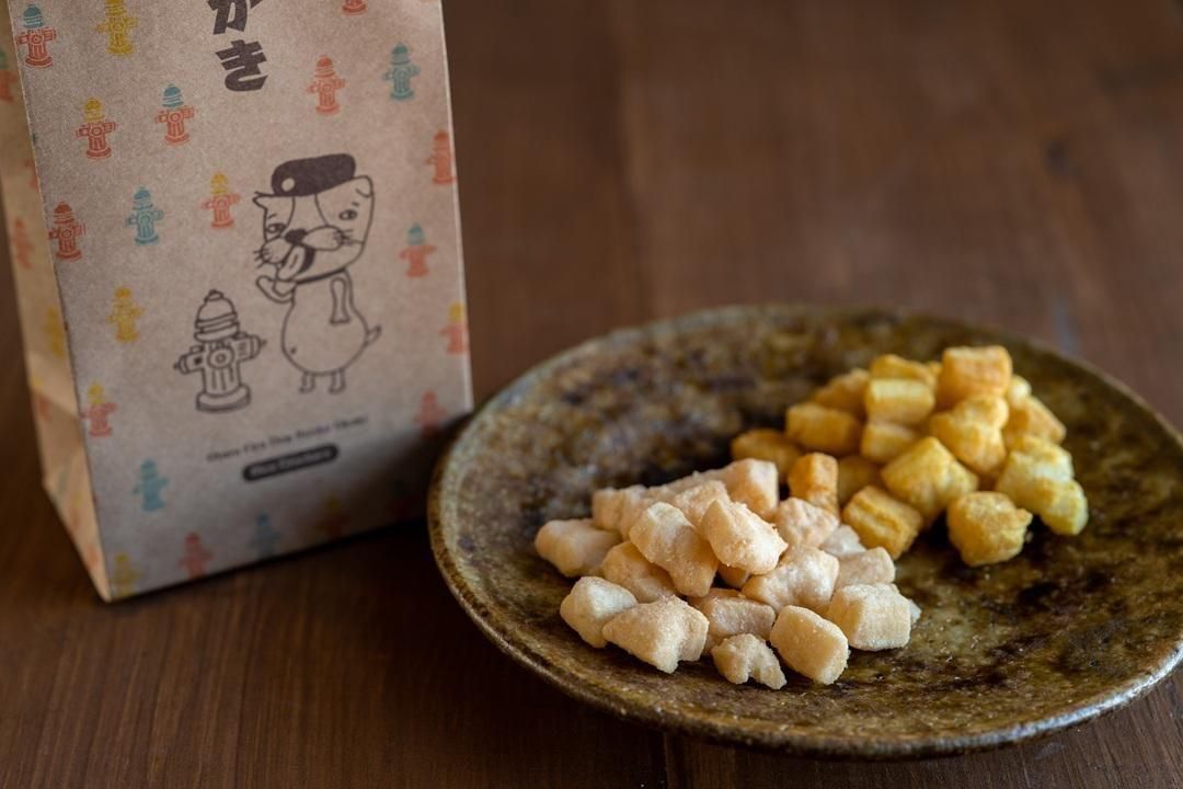 ひと口サイズで食べやすく、お酒のおつまみやお子様のおやつにもお楽しみいただける『消防犬ぶん公おかき』、手土産にもおススメの一品です。