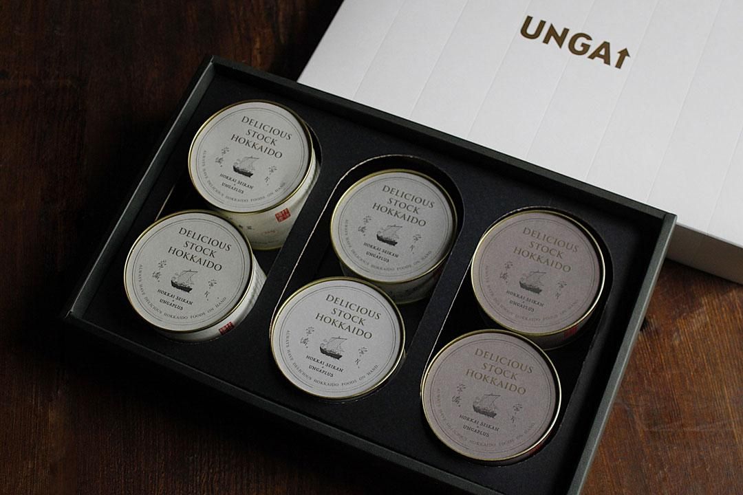 UNGAPLUSオリジナルの『DELICIOUS STOCK HOKKAIDO』より、畜産品、水産品、農産品の3種類の缶詰を詰め合わせたギフトセットです。