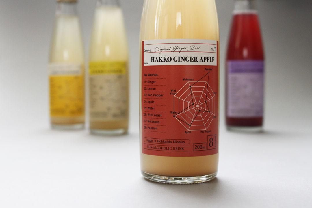 『HAKKO GINGER APPLEL No.7』は、北海道仁木町の妹尾農園が育てた「つがるりんご」を使用し、低温発酵させ、搾汁したリンゴに、さらに生姜、レモン、唐辛子や糖蜜を加え、北海道に自生する蝦夷山桜の酵母で発酵させました。天然の華やかな香り、しっかりとした辛さとやさしい甘みが特徴のヘルシードリンクです。