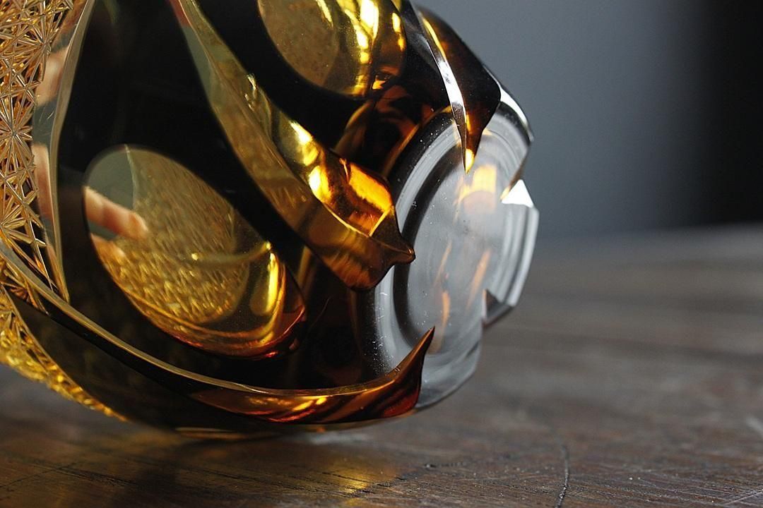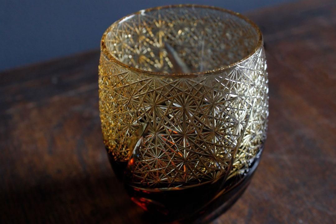 小樽の深川硝子工芸の『小樽切子』の「漁火 タンブラー」の黒琥珀。卓越した技術で刻まれたカットが目を引く美しい小樽硝子のグラスです。