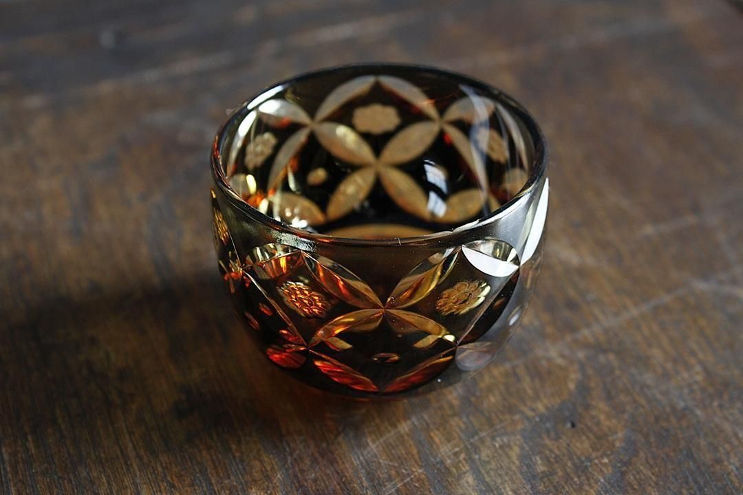 小樽の深川硝子工芸の『小樽切子』の「花七宝 ぐい呑」の黒琥珀。卓越した技術で刻まれたカットが目を引く美しい小樽硝子のグラスです。