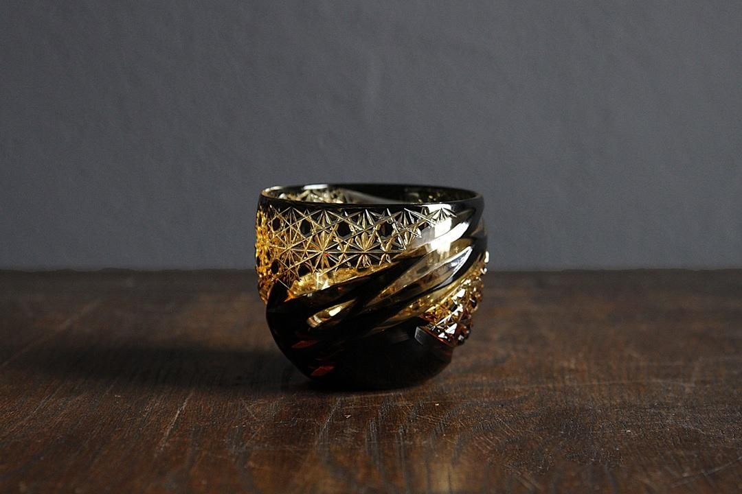 小樽の深川硝子工芸の『小樽切子』の「雅 ぐい呑」の黒琥珀。卓越した技術で刻まれた流線的なカットが目を引く美しい小樽硝子のグラスです。