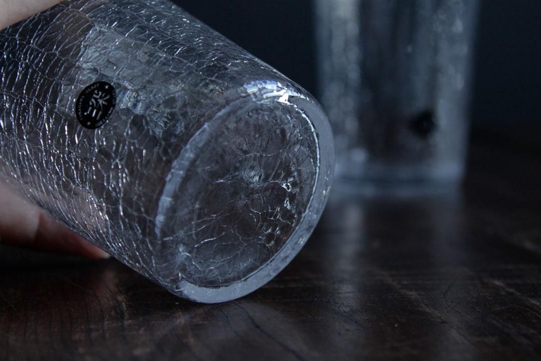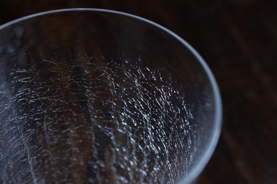吹きガラスで成型した熱いグラスを水の中に一瞬入れることで、表面に細かなひび模様が入り、やわらかな明かりを放つ表情が生まれます。