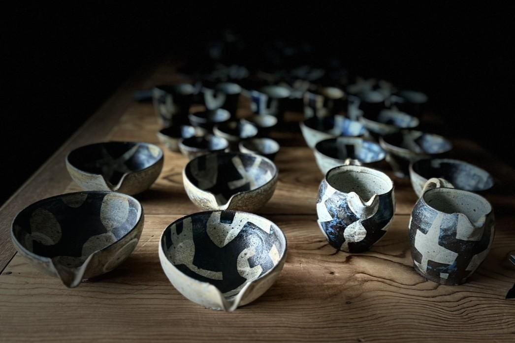 ユニークな視点で描く絵柄が印象的な清水さんの器。本展では、日本の伝統的な染色技法である「型染め」から着想を得て、木々や動物をモチーフに、おおらかな絵付けが施された青化粧の器をご紹介しています。
