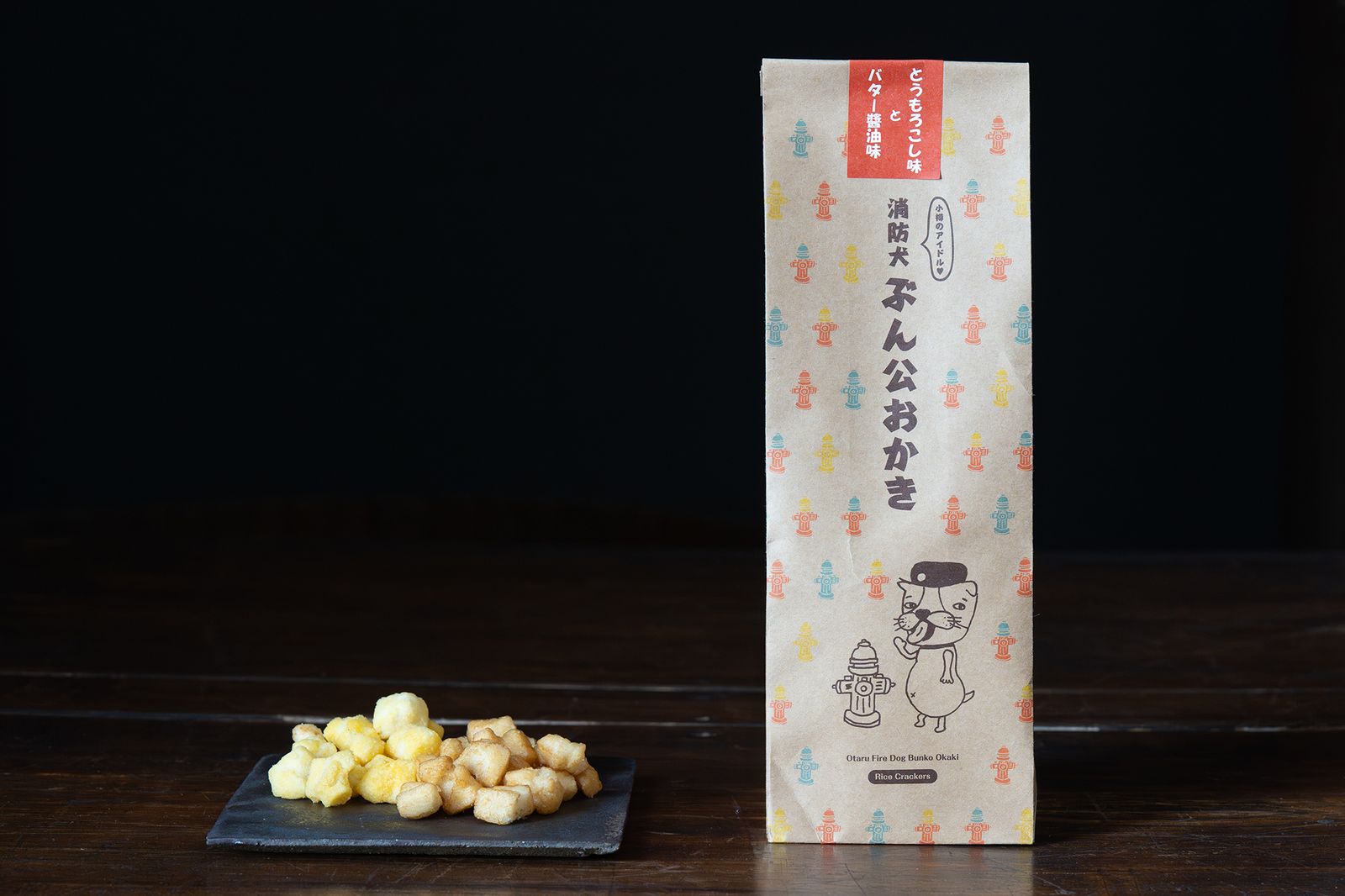 The packaging is also attractive, with a paper bag dotted with colorful fire hydrants and an eye-catching illustration of the adorable "Fire Dog Bunko." Because Otaru has many slopes and a complex water supply route, the bottles are color-coded in red, blue, and yellow to make it easy to tell at a glance which water distribution system they are on.