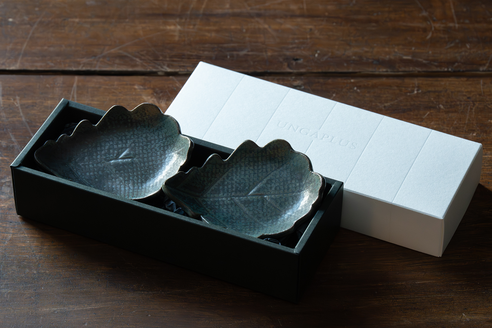 築地吉郎為小樽百貨 UNGAPLUS 設計了兩款原創小盤子,以吉祥的橡樹葉圖案為特色。