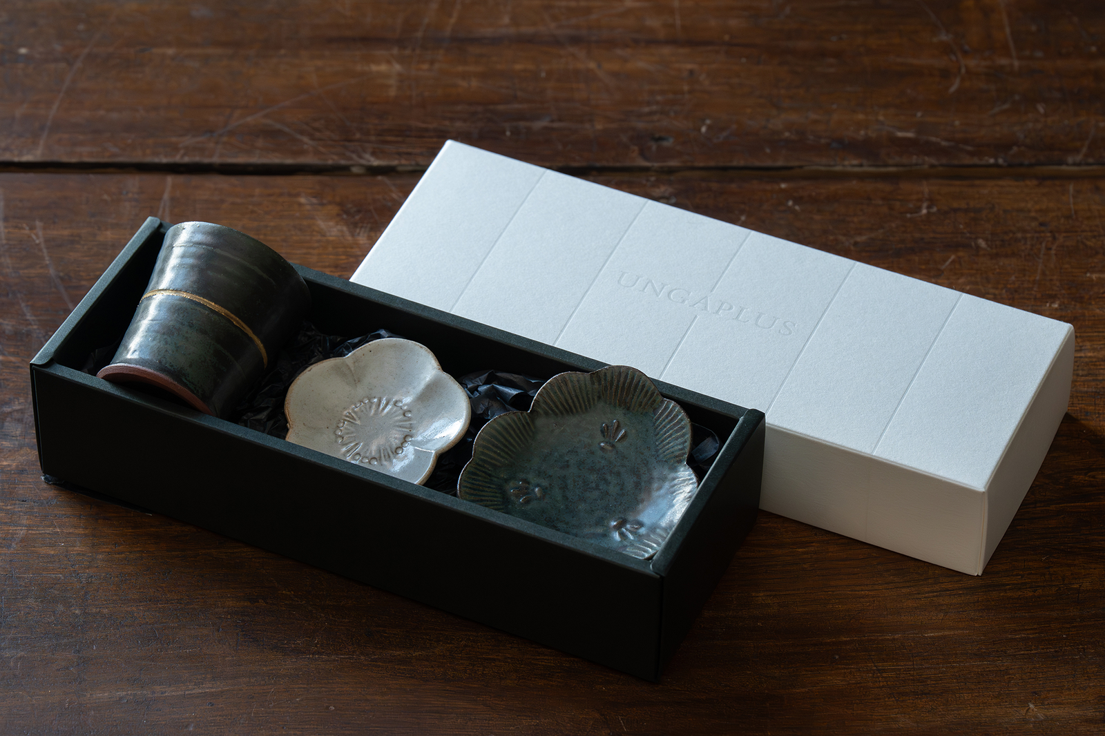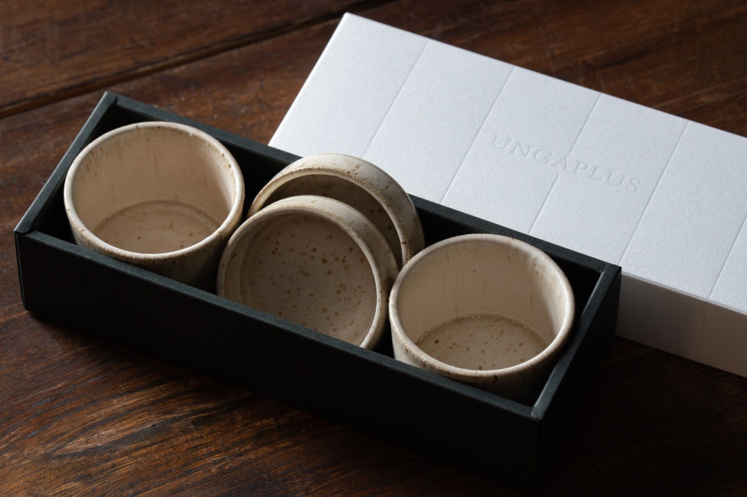 此套裝可將不同高度的圓形器皿疊放收納,其設計靈感源自於「圓形(邊緣)重疊」的概念。尺寸適中的獨立式杯子和小碟子組合,不僅可作為日式和西式餐具使用,也適用於各種其他生活場景,例如擺放在桌面或梳妝台上。套裝提供兩種顏色可選:“大理石紋”,具有木質質感;以及“黑色”,具有啞光炭灰色質感。兩對套裝將裝在UNGAPLUS原廠禮盒中。