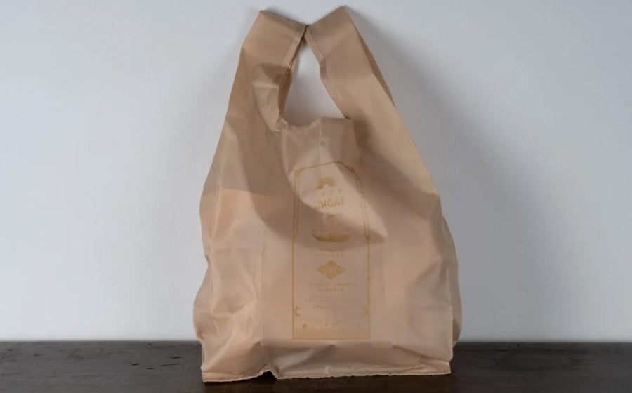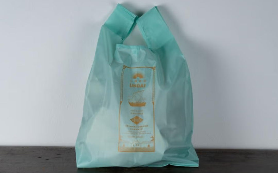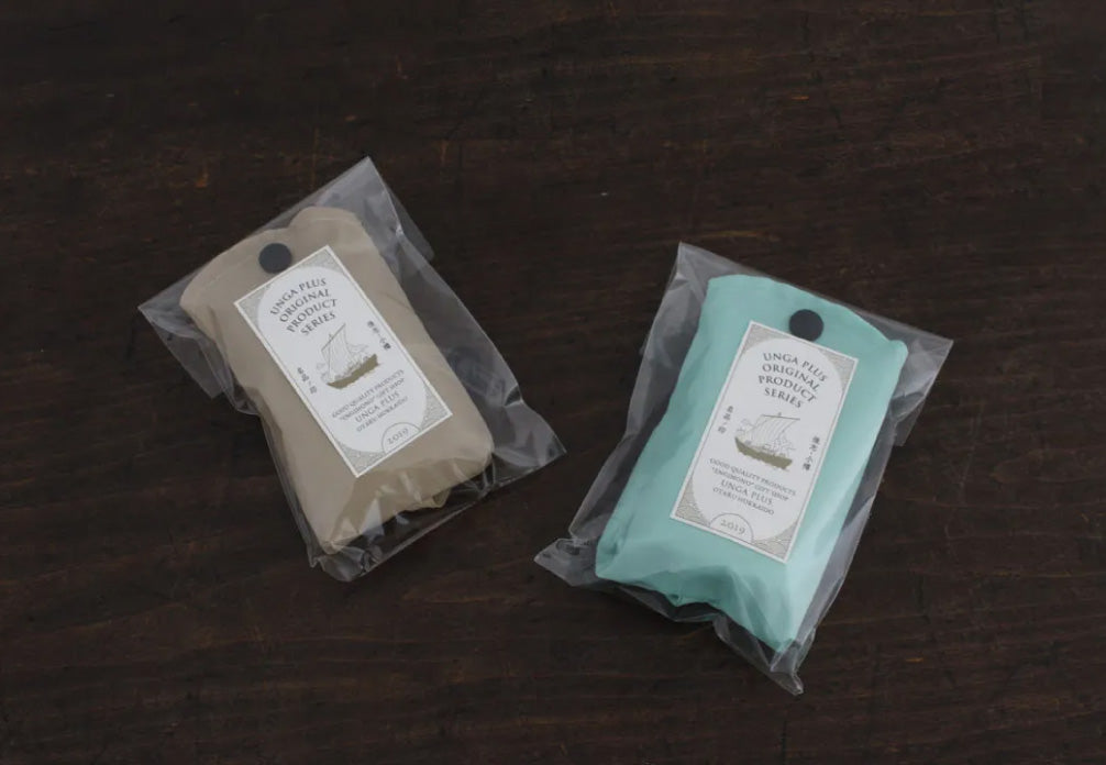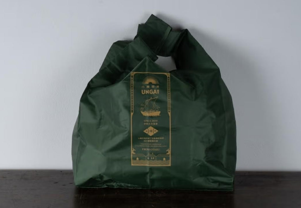 UNGAPLUS環保袋印有UNGAPLUS商標。該商標以北前船為寶船圖案,船上載有七福神,並印有小樽倉庫的商號「Shipping x Good Fortune」(航運×好運)。袋子上裝飾著寶船上常見的回文圖案,寓意著希望好運永駐小樽這座海濱城市。
