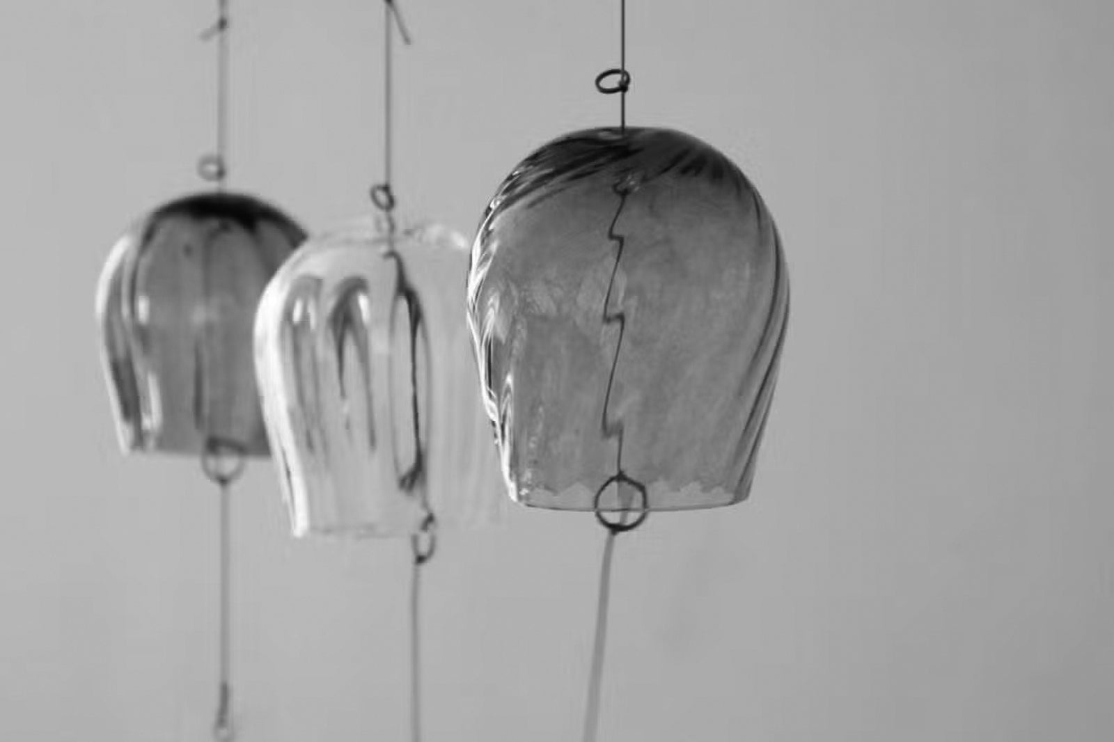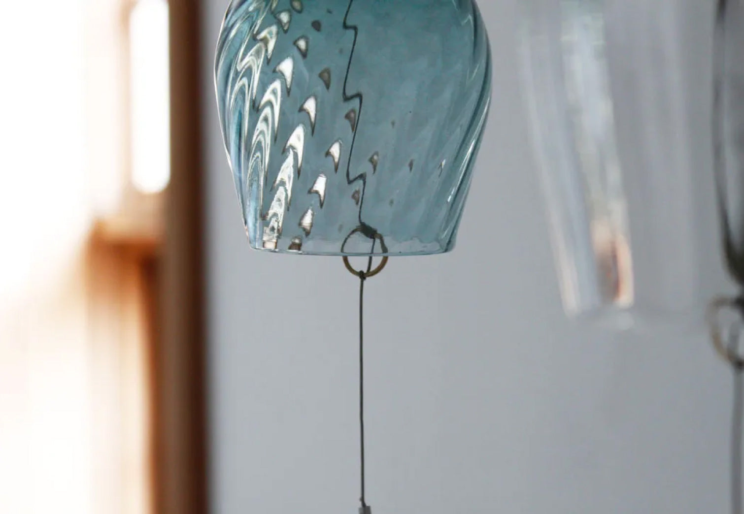 這款風鈴由透明玻璃製成,帶有寬大的垂直線條,使其外觀柔和。