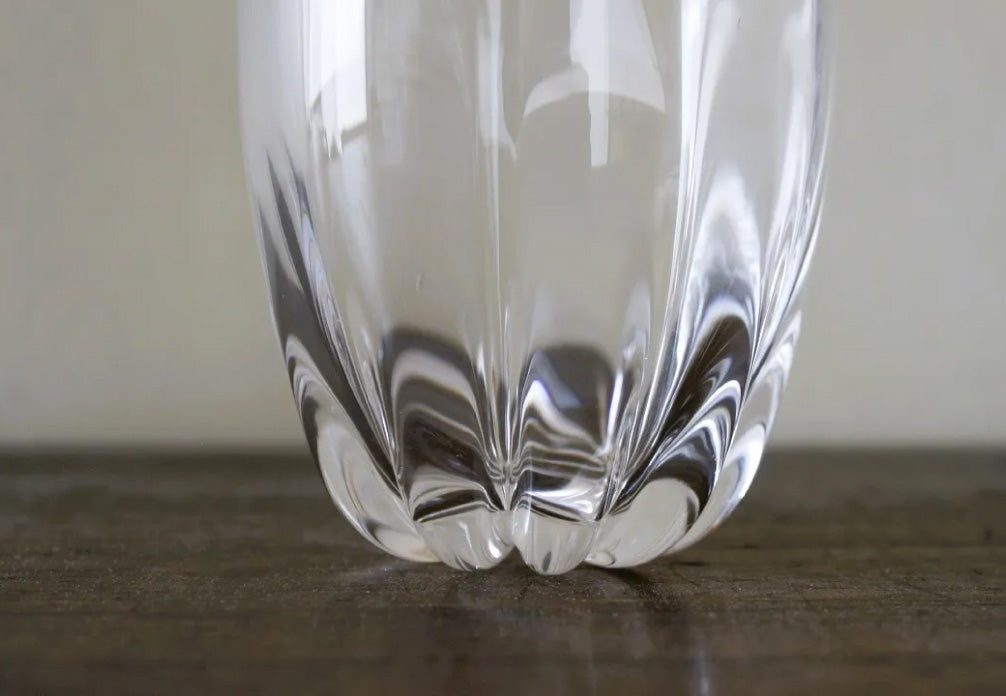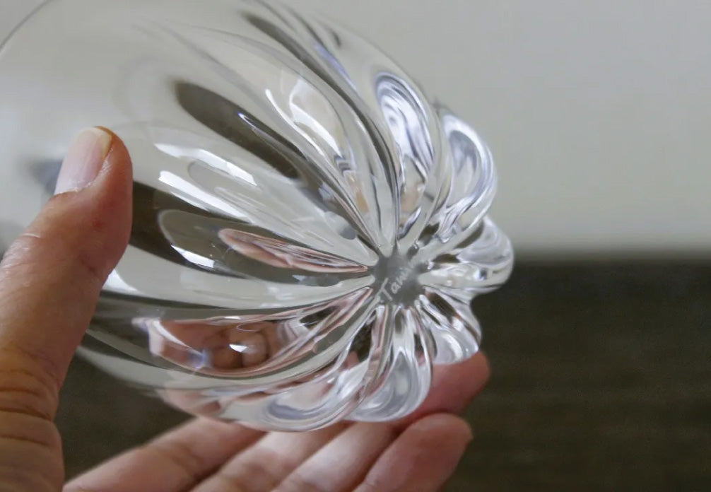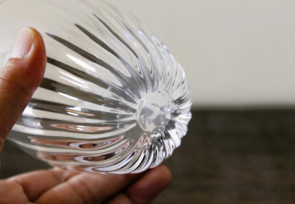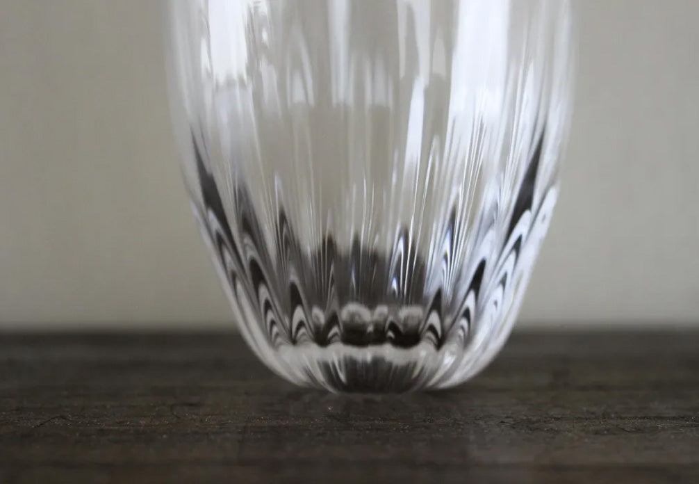 這是名為「菊花」的玻璃杯。杯身飾以精細的線條,杯底則繪有菊花花瓣。這款玻璃杯線條優美,宛如大自然的傑作,令人印象深刻。杯身厚實的玻璃表面不平整,垂直的線條和不規則的紋理交相輝映,光影變幻,更添這款玻璃杯的迷人魅力。