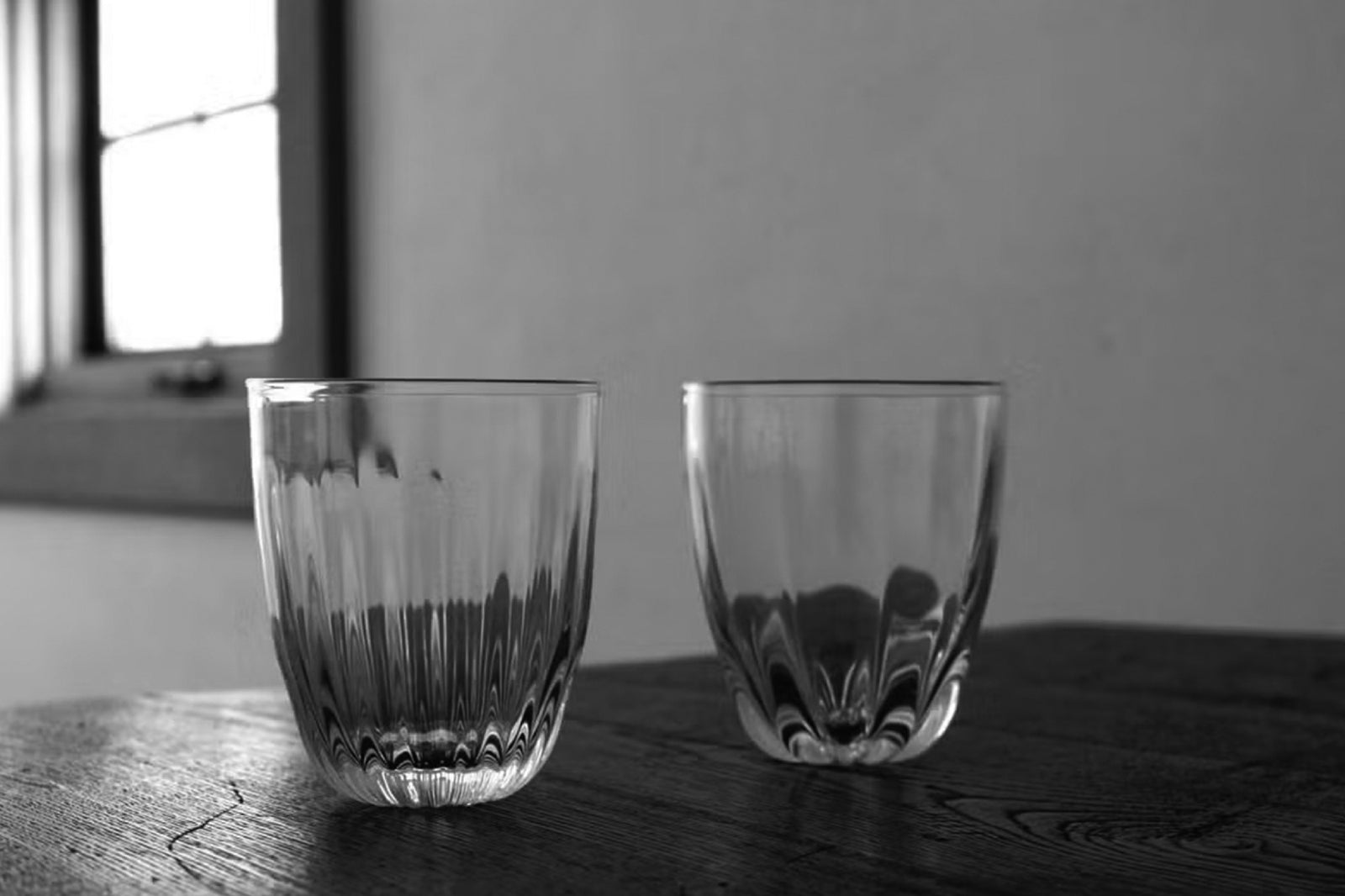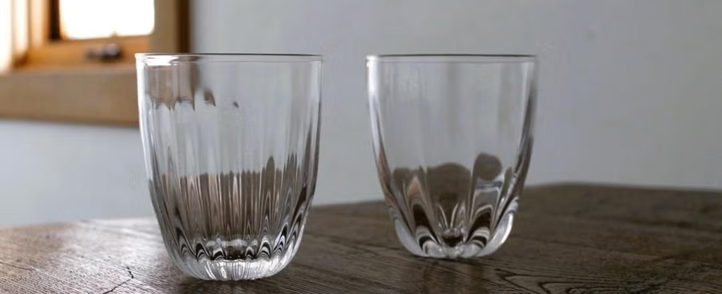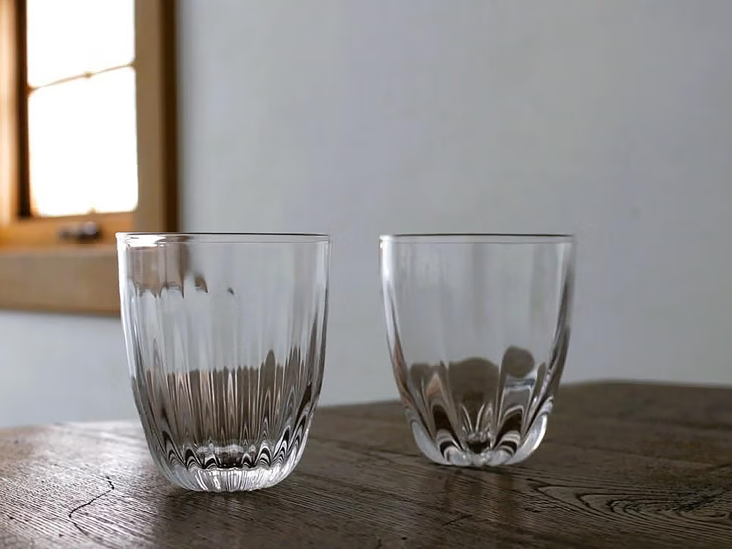 這是名為「菊花」的玻璃杯。杯身飾以精細的線條,杯底則繪有菊花花瓣。這款玻璃杯線條優美,宛如大自然的傑作,令人印象深刻。杯身厚實的玻璃表面不平整,垂直的線條和不規則的紋理交相輝映,光影變幻,更添這款玻璃杯的迷人魅力。
