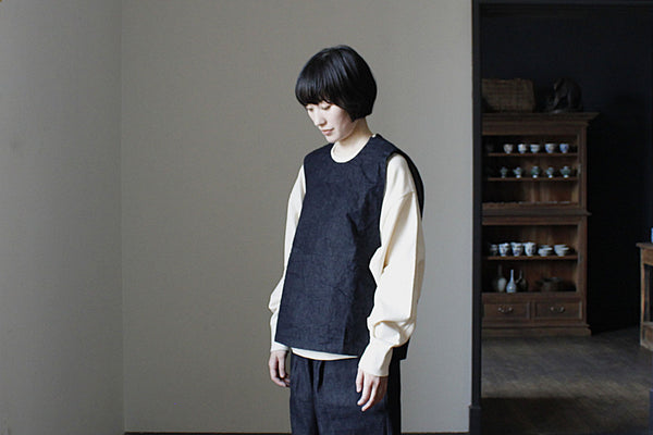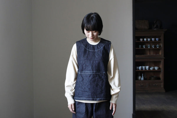 這款背心採用岡山縣生產的牛仔布製成,設計簡潔,並帶有白色縫線。定價 ¥14,800 定價售價 ¥14,800 單價 / 每立即購買
